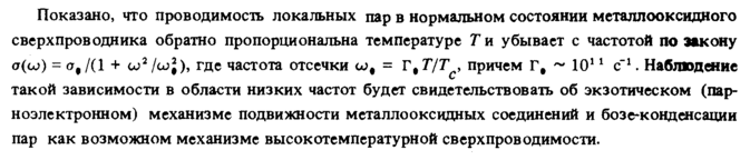 Показано, что проводимость локальных пар в нормальном состоянии металлооксидного сверхпроводника обратно пропорциональна температуре Г и убывает с частотой по закону σ(ω) = σ9 /(1 + со2 /cjJ), где частота отсечки ω9 = Г# Т/Т , причем Г# ~ 1011 с"1. Наблюдение такой зависимости в области низких частот будет свидетельствовать об экзотическом (пар-ноэлектронном) механизме подвижности металлооксидных соединений и бозе-конденсации пар как возможном механизме высокотемпературной сверхпроводимости.