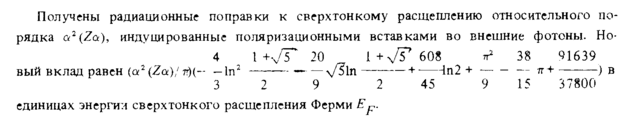 Получены радиационные поправки к сверхтонкому расщеплению относительного порядка α2 (Za), индуцированные поляризационными вставками во внешние фотоны. Но4 I +vT 20 l+^JT 608 л2 38 91639 вый вклад равен (a2 (Zot)/ -In2 ——-----\/5ln------+--1η2 +----π+-) в 3 2 9 2 45 9 15 37800 единицах энергии сверхтонкого расщепления Ферми Ер.