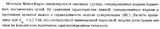 Методом Монте-Карло анализируются мюонные группы, генерированные ядрами первичных космических лучей. Из сравнения характеристик ливней, генерированных ядрами и протонами делается вывод о справедливости модели суперпозиции (МС). Расчеты проделаны для Ε μ = 0,2 ТэВ, что соответствует минимальной пороговой энергии регистрации мю-онов на Баксанском подземном сцинтилляционном телескопе.