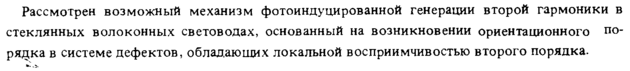 Рассмотрен возможный механизм фотоиндуцированной генерации второй гармоники в стеклянных волоконных световодах, основанный на возникновении ориентационного порядка в системе дефектов, обладающих локальной восприимчивостью второго порядка.