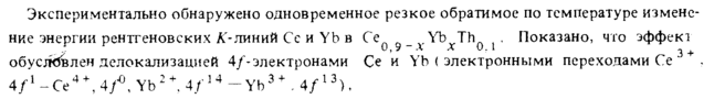 Экспериментально обнаружено одновременное резкое обратимое по температуре изменение энергии рентгеновских К-линий Се и Yb в Се .Yb Τη Показано, что эффект . 0,9 -V X 0.1 . + обусловлен делокализацией 4/-электронами Се и Yb ( электронными переходами Се 4/1-Се4+,4/°ЛЬ2+. 4/,4-Yb3+.4/13).