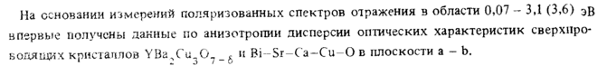 На основании измерений поляризованных спектров отражения в области 0,07 -3,1 (3,6) ЭВ впервые получены данные по анизотропии дисперсии оптических характеристик сверхпроводящих кристаллов УВаЛСи,С> _ , и Bi-Sr-Ca-Cu-Ο в плоскости а Ь.