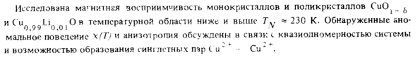 Исследована магнитная восприимчивость монокристаллов и поликристаллов CuO fi и Си Li О в температурной области ниже и выше 7\, * 230 К. Обнаруженные ано0,9 9" 0,01 г '» мальное поведение х(Т) и анизотропия обсуждены в связи с квазиодномерностью системы / ■ 2 + /~ 2 + и возможностью образования син] летных пар С и Си