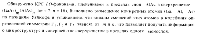 Обнаружено КРС /.Офононами. плененными в пределах слоя AlAs, в сверхрешетке (GaAs) (AlAs)^ (m 7. η = 18), Выполнено размещение конкретных атомов (Ga, Al, As) по позициям Уайкофа и установлено, что вклады смещений этих атомов в колебания определенной симметрии Γι.Γ: и г« зависят от m и п. что позволяет получить информацию о микрострукт уре и совершенстве сверхрешеток в пределах одного монослоя.