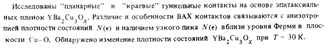 Исследованы "планарные" и ''краевые" туннельные контакты на основе эпитаксиаль-ных пленок YBa Си О , Различие и особенности ΒΑΧ контактов связываются с анизотро2 3 X пией плотности состояний N(e) и наличием узкого пика N(e) вблизи уровня Ферми в плоскости Си-О. Обнаружено изменение плотности состояний УЪ*2^'из®х ПРИ ^ " ^0 К.