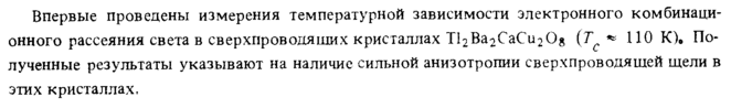 Впервые проведены измерения температурной зависимости электронного комбинационного рассеяния света в сверхпроводящих кристаллах T^l^CaCi^Og (Τ * 110 Κ)β Полученные результаты указывают на наличие сильной анизотропии сверхпроводящей щели в этих кристаллах,