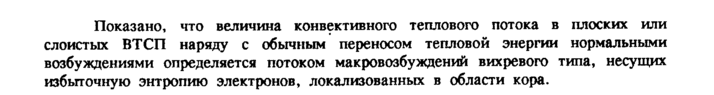 Показано, что величина конвективного теплового потока в плоских или слоистых ВТСП наряду с обычным переносом тепловой энергии нормальными возбуждениями определяется потоком макровозбуждений вихревого типа, несущих избыточную энтропию электронов, локализованных в области кора.