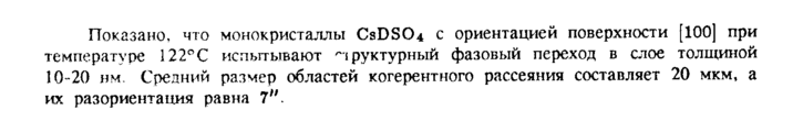 Показано, что монокристаллы CsDS04 с ориентацией поверхности [100] при температуре 122°С испытывают ηруктурный фазовый переход в слое толщиной 10-20 нм. Средний размер областей когерентного рассеяния составляет 20 мкм, а их разориентация равна 7".