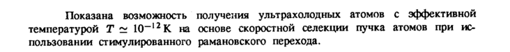 Показана возможность получения ультрахолодных атомов с эффективной температурой Χ ~ Ю-12 К на основе скоростной селекции пучка атомов при использовании стимулированного рамановского перехода.