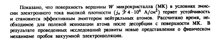 Показано, что поверхность вершины W микрокристалла (МК) в условиях эмиссии электронного тока высокой плотности (je 5* 4-106 А/см2) теряет устойчивость и становится эффективным эмиттером нейтральных атомов. Рассчитано время, необходимое для полевой ионизации атома после десорбции с поверхности МК. В результате проведенных исследований развиты новые представления о физическом механизме пробоя вакуумной электроизоляции.