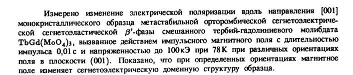 Измерено изменение электрической поляризации вдоль направления [001] монокристаллического образца метастабильной орторомбической сегнетоэлектриче-ской сегнетоэластической /З'-фазы смешанного тербий-гадолиниевого молибдата TbGd(Mo04)3, вызванное действием импульсного магнитного поля с длительностью импульса 0,01с и напряженностью до 100 кЭ при 78 К при различных ориентациях поля в плоскости (001). Показано, что при определенных ориентациях магнитное поле изменяет сегнетоэлектрическую доменную структуру образца.