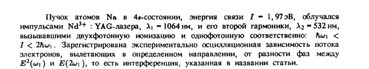 Пучок атомов Na в 4в-состоянии, энергия связи / 1,97эВ, облучался импульсами Nd3+ : YAG-лазера, λ| -1064нм, и его второй гармоники, А2~532нм, вызывавшими двухфотонную ионизацию и однофотонную соответственно: hw\ < / < 2Κω\. Зарегистрирована экспериментально осцилляционная зависимость потока электронов, вылетающих в определенном направлении, от разности фаз между Ε2(ω\) и Ε(2ω\), то есть интерференция, указанная в названии статьи.