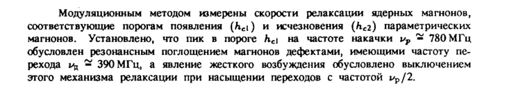 Модуляционным методом измерены скорости релаксации ядерных магнонов, соответствующие порогам появления (hci) и исчезновения (Л^г) параметрических магнонов. Установлено, что пик в пороге hc\ на частоте накачки ир 780 МГц обусловлен резонансным поглощением магнонов дефектами, имеющими частоту перехода j>r 390 МГц, а явление жесткого возбуждения обусловлено выключением этого механизма релаксации при насыщении переходов с частотой ир/2.