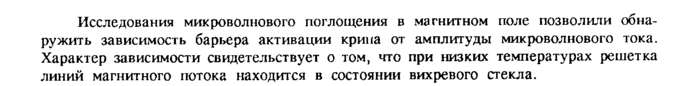 Исследования микроволнового поглощения в магнитном поле позволили обнаружить зависимость барьера активации крипа от амплитуды микроволнового тока. Характер зависимости свидетельствует о том, что при низких температурах решетка линий магнитного потока находится в состоянии вихревого стекла.
