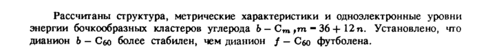 Рассчитаны структура, метрические характеристики и одноэлектронные уровни энергии бочкообразных кластеров углерода Ь Ст Рт 36 + 12 п. Установлено, что дианион Ь Сбо более стабилен, чем дианион / Сбо футболена.