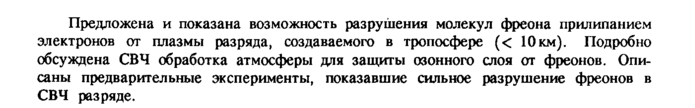 Предложена и показана возможность разрушения молекул фреона прилипанием электронов от плазмы разряда, создаваемого в тропосфере (< 10 км). Подробно обсуждена СВЧ обработка атмосферы для защиты озонного слоя от фреонов. Описаны предварительные эксперименты, показавшие сильное разрушение фреонов в СВЧ разряде.