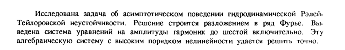 Исследована задача об асимптотическом поведении гидродинамической Рэлей-Тейлоровской неустойчивости. Решение строится разложением в ряд Фурье. Выведена система уравнений на амплитуды гармоник до шестой включительно. Эту алгебраическую систему с высоким порядком нелинейности удается решить точно.
