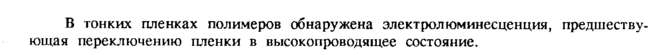 В тонких пленках полимеров обнаружена электролюминесценция, предшествующая переключению пленки в высокопроводящее состояние.