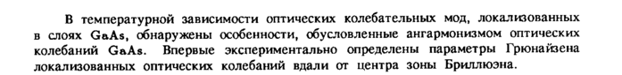 В температурной зависимости оптических колебательных мод, локализованных в слоях GaAs, обнаружены особенности, обусловленные энгармонизмом оптических колебаний GaAs. Впервые экспериментально определены параметры Грюнайзена локализованных оптических колебаний вдали от центра зоны Бриллюэна.