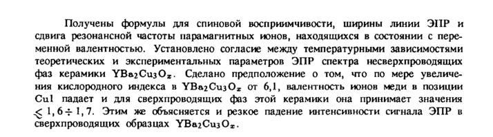 Получены формулы для спиновой восприимчивости, ширины линии ЭПР и сдвига резонансной частоты парамагнитных ионов, находящихся в состоянии с переменной валентностью. Установлено согласие между температурными зависимостями теоретических и экспериментальных параметров ЭПР спектра несверхпроводящих фаз керамики УВагСизОх. Сделано предположение о том, что по мере увеличения кислородного индекса в УВагСизОх от 6,1, валентность ионов меди в позиции Cul падает и для сверхпроводящих фаз этой керамики она принимает значения <С. 1,6-г 1,7. Этим же объясняется и резкое падение интенсивности сигнала ЭПР в сверхпроводящих образцах УВа2СизОх.
