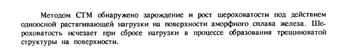 Методом СТМ обнаружено зарождение и рост шероховатости под действием одноосной растягивающей нагрузки на поверхности аморфного сплава железа. Шероховатость исчезает при сбросе нагрузки в процессе образования трещиноватой структуры на поверхности.