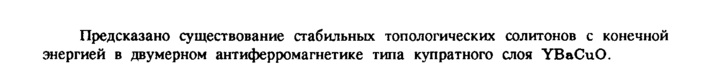 Предсказано существование стабильных топологических солитонов с конечной энергией в двумерном антиферромагнетике типа купратного слоя YBaCuO.