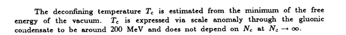 The deconfining temperature Tc is estimated from the minimum of the free energy of the vacuum. Tc is expressed via scale anomaly through the gluonic condensate to be around 200 MeV and does not depend on Nc at iVc —* oo.