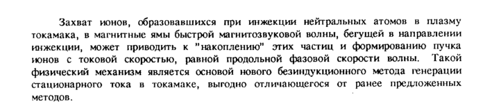 Захват ионов, образовавшихся при инжекции нейтральных атомов в плазму токамака, в магнитные ямы быстрой магнитозвуковой волны, бегущей в направлении инжекции, может приводить к "накоплению" этих частиц и формированию пучка ионов с токовой скоростью, равной продольной фазовой скорости волны. Такой физический механизм является основой нового безиндукционного метода генерации стационарного тока в токамаке, выгодно отличающегося от ранее предложенных методов.