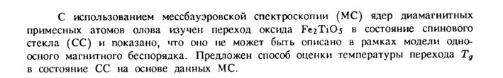 С использованием мессбауэровской спектроскопии (МС) ядер диамагнитных примесных атомов олова изучен переход оксида FC2T1O5 в состояние спинового стекла (СС) и показано, что оно не может быть описано в рамках модели одноосного магнитного беспорядка. Предложен способ оценки температуры перехода Тд в состояние СС на основе данных МС.