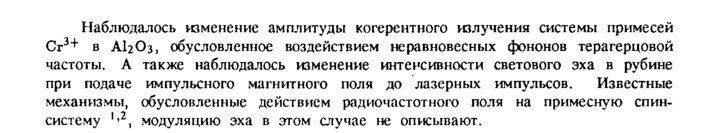 Наблюдалось изменение амплитуды когерентного излучения системы примесей Сг3+ в AI2O3, обусловленное воздействием неравновесных фононов терагерцовой частоты. А также наблюдалось изменение интенсивности светового эха в рубине при подаче импульсного магнитного поля до лазерных импульсов. Известные механизмы, обусловленные действием радиочастотного поля на примесную спин-систему '», модуляцию эха в этом случае не описывают.