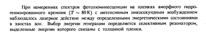При измерениях спектров фотолюминесценции на пленках аморфного гидро-генизированного кремния (Г ~ 80 К) с интенсивным пикосекундным возбуждением наблюдалось лазерное действие между определенными энергетическими состояниями в хвостах зон. Выбор энергии генерации определяется селективным резонатором, выделенные энергии которого связаны с толщиной пленки.