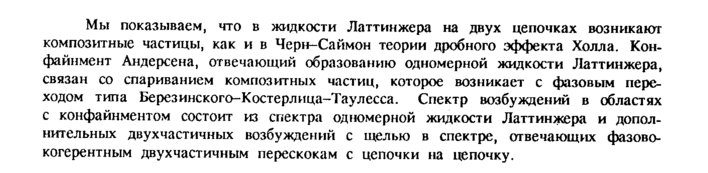 Мы показываем, что в жидкости Латтинжера на двух цепочках возникают композитные частицы, как и в Черн-Саймон теории дробного эффекта Холла. Кон-файнмент Андерсена, отвечающий образованию одномерной жидкости Латтинжера, связан со спариванием композитных частиц, которое возникает с фазовым переходом типа Березинского-Костерлица-Таулесса. Спектр возбуждений в областях с конфайнментом состоит из спектра одномерной жидкости Латтинжера и дополнительных двухчастичных возбуждений с щелью в спектре, отвечающих фазово-когерентным двухчастичным перескокам с цепочки на цепочку.