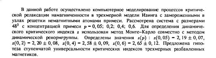 В данной работе осуществлено компьютерное моделирование процессов критической релаксации намагниченности в трехмерной модели Изинга с замороженными в узлах решетки немагнитными атомами примеси. Рассмотрена система с размерами 483 с концентрацией примеси ρ 0,05; 0,2; 0,4; 0,6. Для определения динамического критического индекса ζ использован метод Монте-Карло совместно с методом динамической ренормгруппы. Определены значения ζ(ρ) : ζ(0,05) 2, 19 ± 0, 07, ζ(0,2) -2, 20 ±0,08, *(0,4)-2,58±0,09, ζ(0, 6) 2, 65 ± 0,12. Предложена гипотеза ступенчатой универсальности критических индексов трехмерных разбавленных магнетиков.
