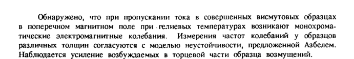 Обнаружено, что при пропускании тока в совершенных висмутовых образцах в поперечном магнитном поле при гелиевых температурах возникают монохроматические электромагнитные колебания. Измерения частот колебаний у образцов различных толщин согласуются с моделью неустойчивости, предложенной Азбелем. Наблюдается усиление возбуждаемых в торцевой части образца возмущений.
