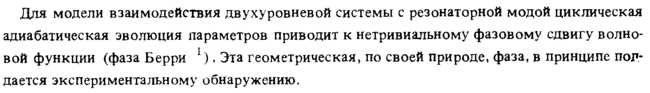 Для модели взаимодействия двухуровневой системы с резонаторной модой циклическая адиабатическая эволюция параметров приводит к нетривиальному фазовому сдвигу волновой функции (фаза Берри ι), Эта геометрическая, по своей природе, фаза, в принципе поддается экспериментальному обнаружению,