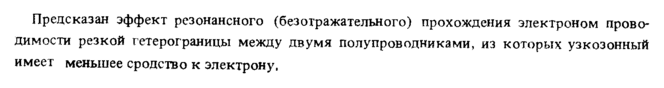 Предсказан эффект резонансного (безотражательного) прохождения электроном проводимости резкой гетерограницы между двумя полупроводниками, из которых узкозонный имеет меньшее сродство к электрону,