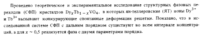 Проведено теоретическое и экспериментальное исследование структурных фазовых переходов (СФП) кристаллов DyxTbj _XV04, в которых ян-теллеровские (ЯТ) ионы Dy и Tb3+вызывают конкурирующие спонтанные деформации решетки. Показано, что в исследованной системе СФП с дальним порядком существуют во всем интервале концентраций, а для χ ~ 0,5 реализуется фаза с двумя параметрами порядка.