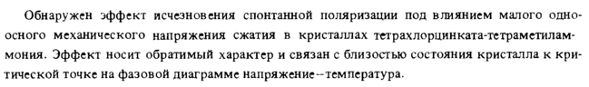 Обнаружен эффект исчезновения спонтанной поляризации под влиянием малого одноосного механического напряжения сжатия в кристаллах тетрахлорцинката-тетраметилам-мония. Эффект носит обратимый характер и связан с близостью состояния кристалла к критической точке на фазовой диаграмме напряжение-температура.