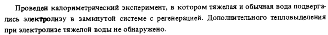 Проведен калориметрический эксперимент, в котором тяжелая и обычная вода подвергались электролизу в замкнутой системе с регенерацией. Дополнительного тепловыделения при электролизе тяжелой воды не обнаружено.