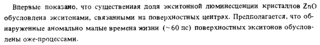 Впервые показано, что существенная доля экситонной люминесценции кристаллов ZnO обусловлена экситонами, связанными на поверхностных центрах. Предполагается, что обнаруженные аномально малые времена жизни (~60 пс) поверхностных экситонов обусловлены оже-процессами.
