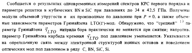 Сообщается о результатах одновременных измерений спектров КРС первого порядка и параметра решетки в кубических BN и SiC при давлениях до 34 и 42,5 ГПа. Получены модули объемной упругости и их производные по давлению при Ρ = 0, а также объемные зависимости параметров Грюнайзена ЬТО(Г)-мод. Обнаружено, что "средний" 1' параметр ГрюнаЙзена ί ^jq нитрида бора практически не меняется при сжатии; напротив, параметр Грюнайзена карбида кремния Ij^jq п°Д Давлением уменьшается. Указывается на определенную связь между электронной структурой ионных остовов и поведением оптических мод под давлением в ряду С, BN, SiC, Si.