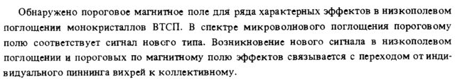 Обнаружено пороговое магнитное поле для ряда характерных эффектов в низкополевом поглощении монокристаллов ВТСП. В спектре микроволнового поглощения пороговому полю соответствует сигнал нового типа. Возникновение нового сигнала в низкополевом поглощении и пороговых по магнитному полю эффектов связывается с переходом от индивидуального пиннинга вихрей к коллективному.