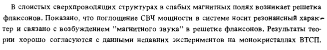 В слоистых сверхпроводящих структурах в слабых магнитных полях возникает решетка флаксонов. Показано, что поглощение СВЧ мощности в системе носит резонансный харак<-тер и связано с возбуждением "магнитного звука" в решетке флаксонов, Результаты теории хорошо согласуются с данными недавних экспериментов на монокристаллах ВТСП,