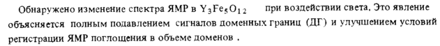 Обнаружено изменение спектра ЯМР в Y3Fe5012 при воздействии света, Это явление объясняется полным подавлением сигналов доменных границ (ДГ) и улучшением условий регистрации ЯМР поглощения в объеме доменов .