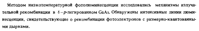 Методом низкотемпературной фотолюминесценции исследовались механизмы излуча-тельной рекомбинации в δ-ρ-легированном GaAs, Обнаружены интенсивные линии люминесценции, свидетельствующие о рекомбинации фотоэлектронов с размерно-квантованными дырками,