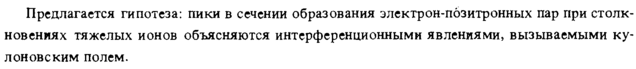 Предлагается гипотеза: пики в сечении образования электрон-позитронных пар при столкновениях тяжелых ионов объясняются интерференционными явлениями, вызываемыми ку-лоновским полем.