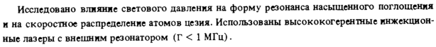 Исследовано влияние светового давления на форму резонанса насыщенного поглощения и на скоростное распределение атомов цезия. Использованы высококогерентные инжекцион-ные лазеры с внешним резонатором (Г < 1 МГц).