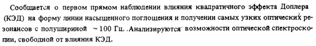 Сообщается о первом прямом наблюдении влияния квадратичного эффекта Доплера (КЭД) на форму линии насыщенного поглощения и получении самых узких оптических ре-зонансов с полушириной ~ 100 Гц, .Анализируются' возможности оптической спектроскопии, свободной от влияния КЭД,