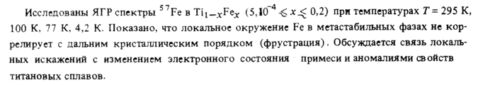 Исследованы ЯГР спектры 57Fe в Tii—^Fe^ (5,10 4 х<. 0,2) при температурах Τ 295 К, 100 К, 77 К, 4,2 К. Показано, что локальное окружение Fe в метастабильных фазах не коррелирует с дальним кристаллическим порядком (фрустрация). Обсуждается связь локальных искажений с изменением электронного состояния примеси и аномалиями свойств титановых сплавов.