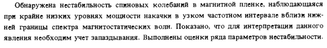 Обнаружена нестабильность спиновых колебаний в магнитной пленке, наблюдающаяся при крайне низких уровнях мощности накачки в узком частотном интервале вблизи нижней границы спектра магнитостатических волн. Показано, что для интерпретации данного явления необходим учет запаздывания. Выполнены оценки ряда параметров нестабильности.